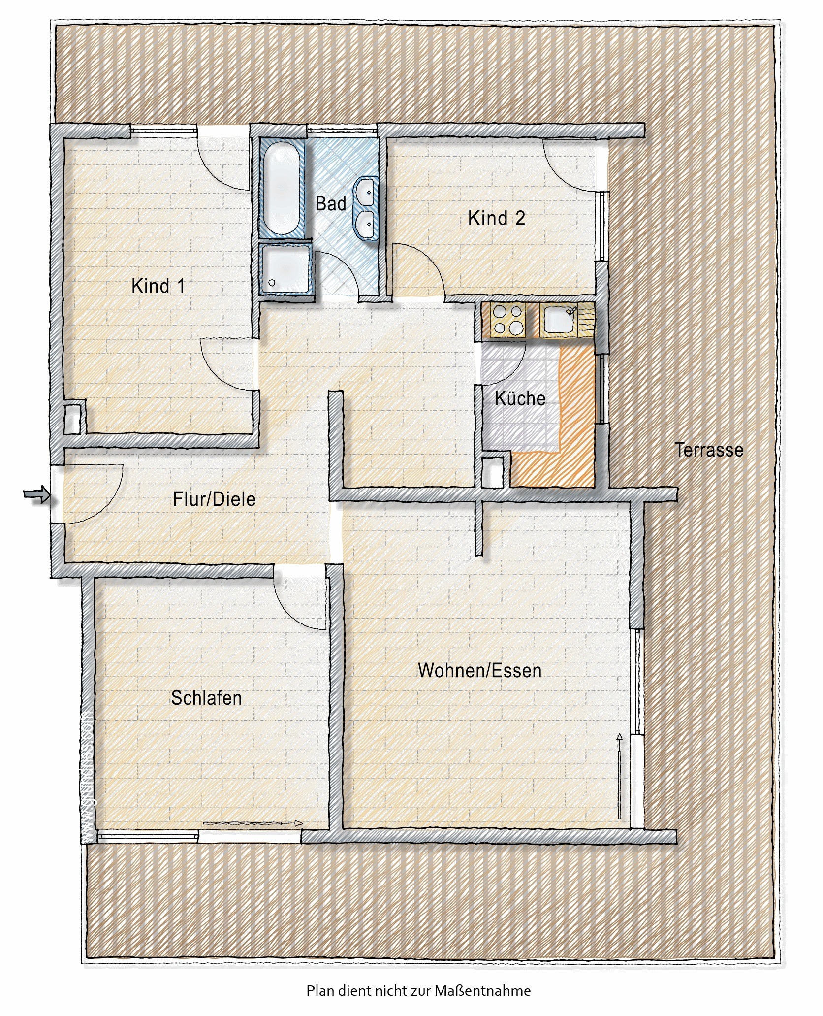 Die Raumaufteilung ist funktional und bietet viel Gestaltungsspielraum. Vom geräumigen Wohnzimmer mit Zugang zur Dachterrasse, drei weitere Zimmer, die sich ideal als Schlafzimmer, Kinderzimmer oder Arbeitsbereich nutzen lassen – alle ebenfalls mit Zugang zur Terrasse. Die Küche mit Fenster bietet Platz für eine moderne Einbauküche, das Badezimmer ist mit Wanne ausgestattet, erfordert jedoch auch eine umfangreiche Sanierung. Große Fensterflächen sorgen für viel Tageslicht in allen Räumen und unterstreichen das großzügige Wohngefühl.