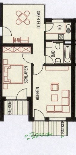Das Herzstück der Wohnung bildet der zentral gelegene, sonnendurchflutete Essplatz, von dem aus alle weiteren Räume bequem erreichbar sind. Er schafft eine offene, einladende Wohnatmosphäre und verbindet Funktionalität mit Charme. Der Essbereich geht fließend in das gemütliche Wohnzimmer über, von dem Sie auf einen der beiden Süd-Balkone treten – perfekt für ein Frühstück in der Morgensonne oder entspannte Stunden im Freien. Auch das Schlafzimmer verfügt über einen eigenen Balkon mit Blick ins Grüne – ein idyllischer Rückzugsort für Ruhe und Erholung.