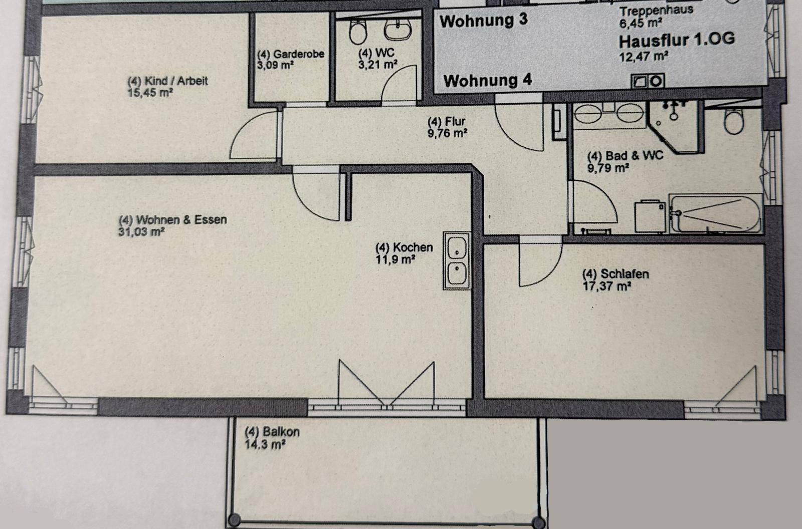 Die großzügige 3-Zimmer-Wohnung im 1. Obergeschoss verfügt über ein geräumiges Bad mit Dusche, WC und Badewanne. Der Wohn-/Essbereich mit offener Küche und einer Nutzfläche von mehr als 40 m² ist ein offener, attraktiver Lebensraum. Von dort aus ist der nach Süden ausgerichtete Balkon zugänglich.
